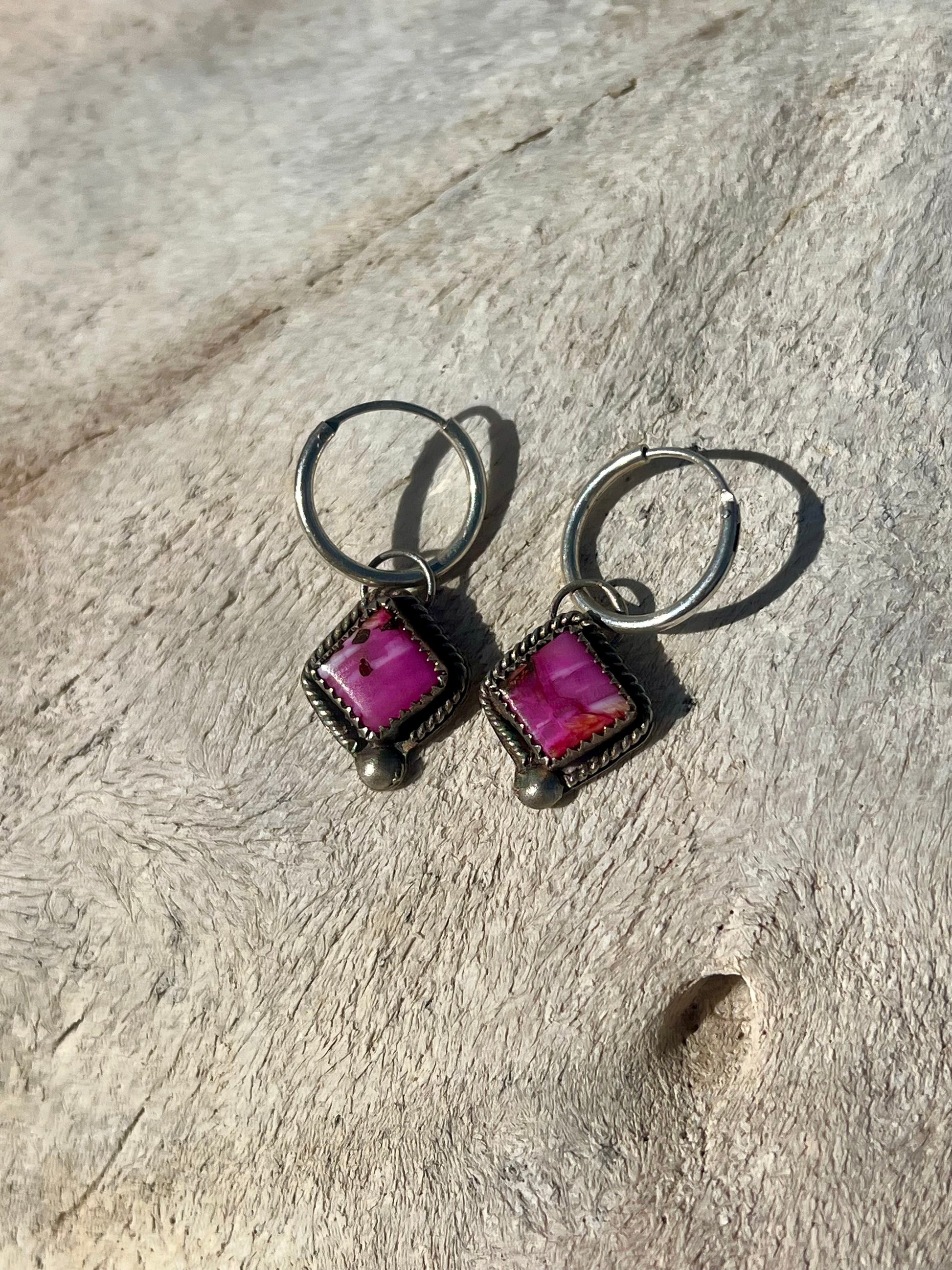 The "War Paint" features elegant pink dahlia stones encased in .999 fine silver bezels. The bezels are complemented by .925 sterling silver, showcasing a rope wire border, decorative balls, and smaller-sized hoops perfect for daily wear.