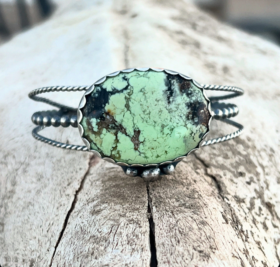 The “Painted Valley” beaded rope cuff is made with a stunning combination of a chrysoprase stone and set in .925 sterling silver, creating a timeless statement piece.